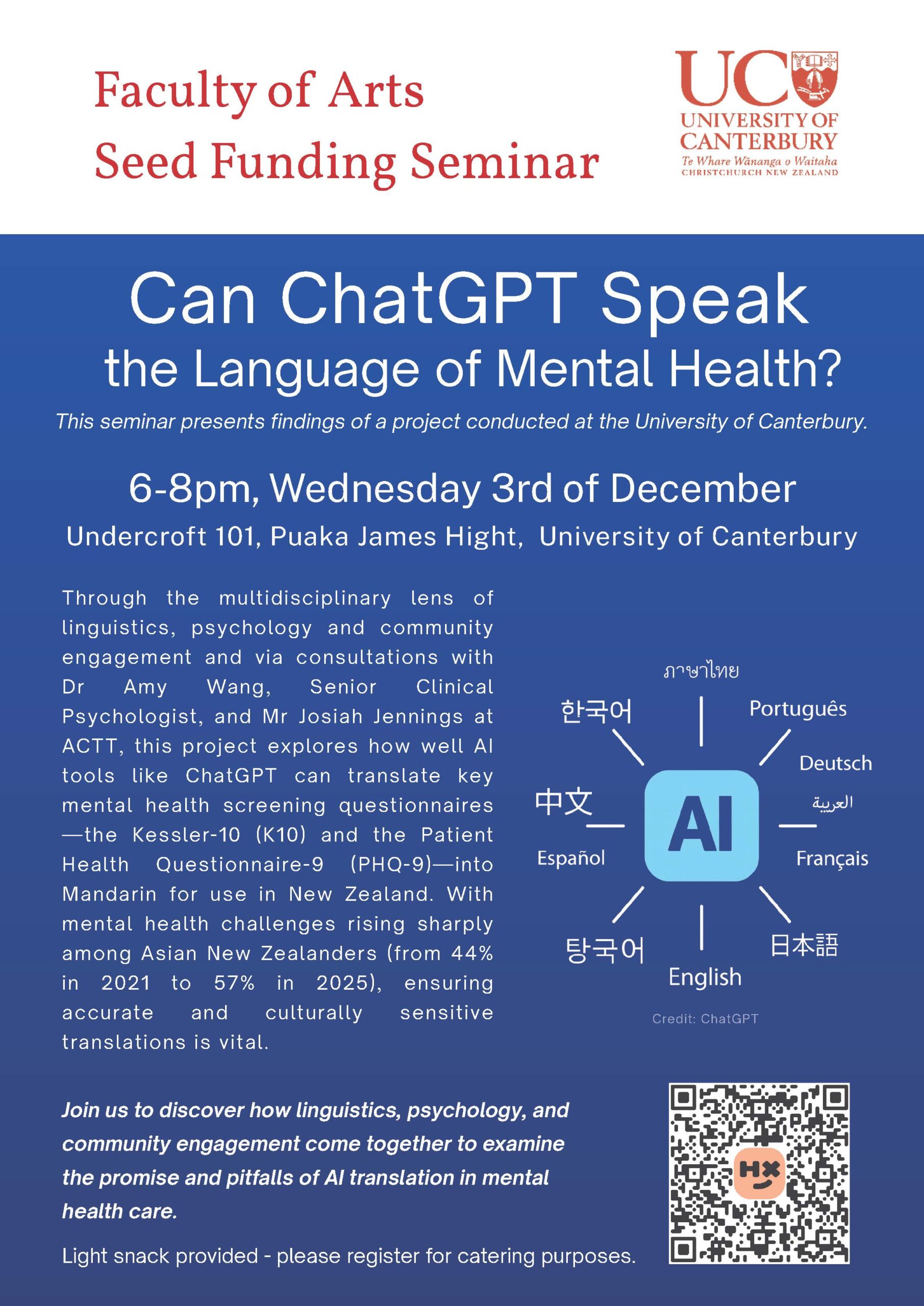 You are cordially invited to the seminar: Can ChatGPT Speak the Language of Mental Health? 6-8pm 3 December, Undercroft 101 This seminar presents findings of a project conducted at the University of Canterbury by Dr Wei Teng (Chinese + Translation & Interpreting programmes, Global Cultural and Language Studies) and was funded through the Faculty of […]